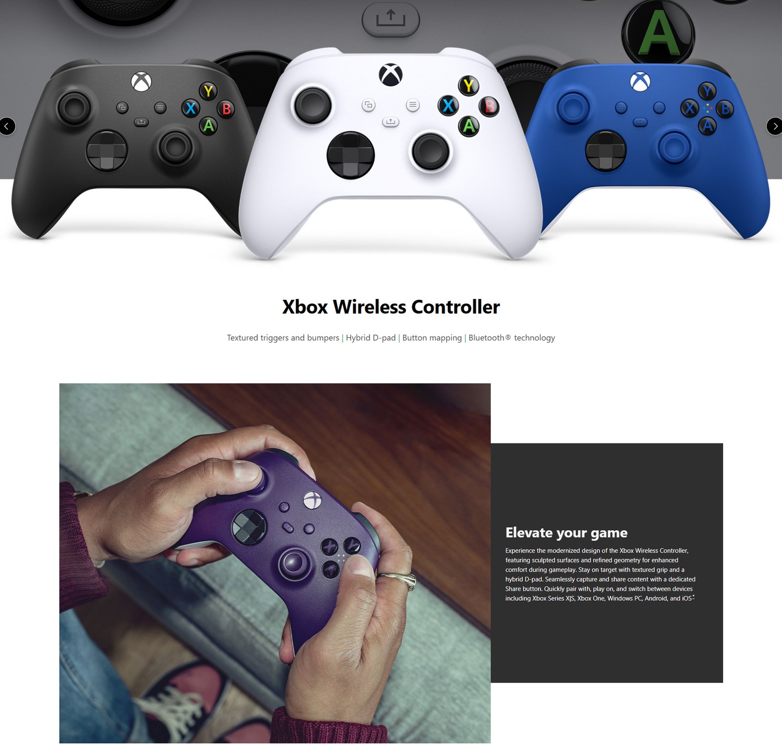 Textured triggers and bumpers | Hybrid D-pad | Button mapping | Bluetooth® technology